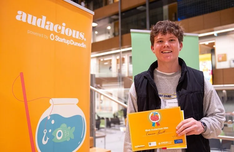 Cameron with his prize for ‘most audacious idea’ at the 2021 Audacious awards.