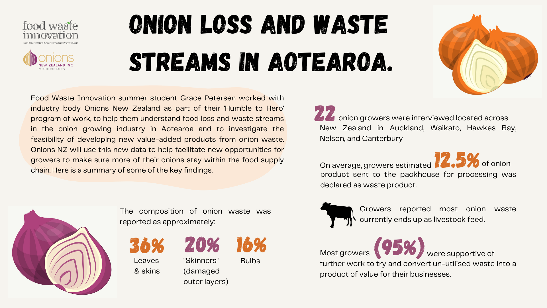 This infographic summarises the findings of a summer research project commissioned by Onions New Zealand. The project was conducted by summer student Grace Petersen and investigated food waste in the onion-growing industry as well as an appetite for the development of value-added streams for this waste.